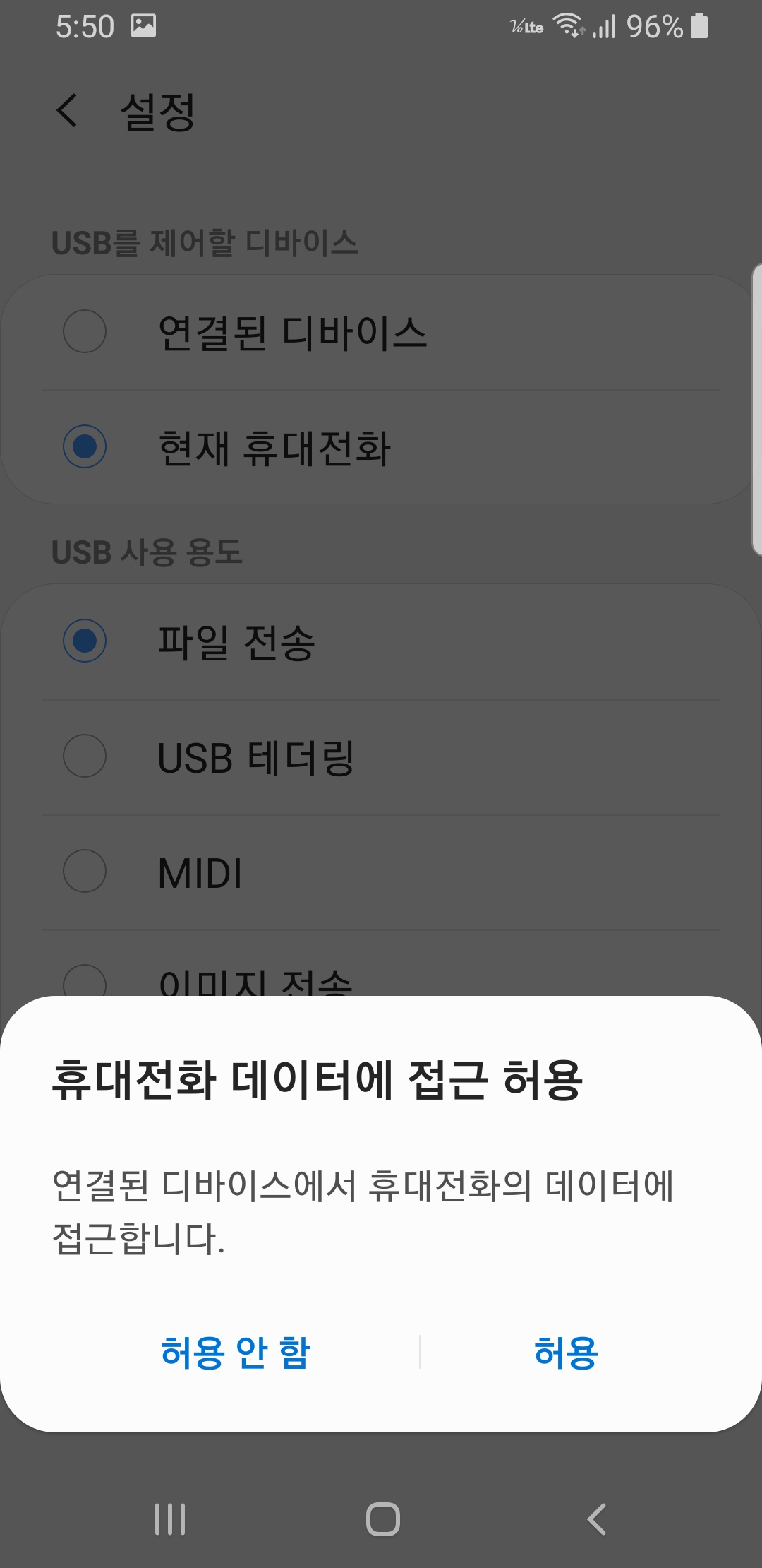 이제 다시 usb케이블을 폰과 컴퓨터에 연결합니다.