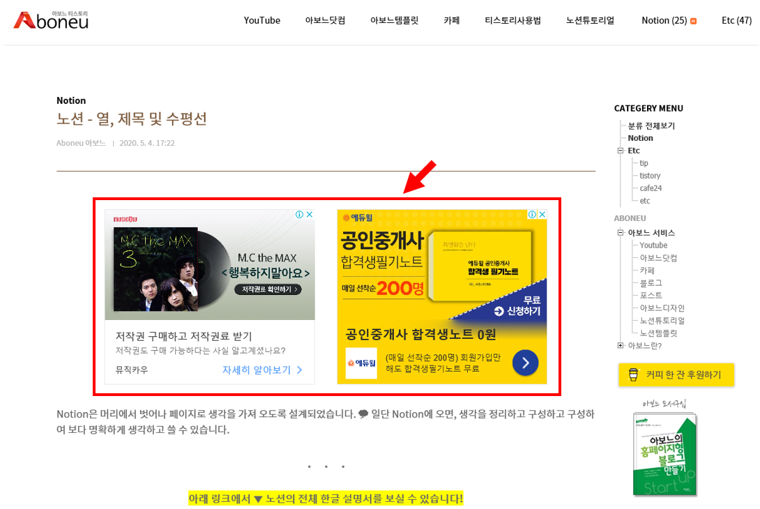 중요한 건 사이트 연결을 위한 html 소스는 삭제 후에도 콘텐츠에 적용된 광고가 아래 이미지 캡처처럼 문제 없이 다 잘 나옵니다. ▼