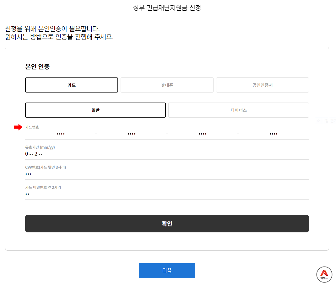 본인 인증 방법을 선택한 후 '카드' 로 인증할 때는 아래대로 카드번호 정보를 넣어 [확인] - [다음]을 클릭합니다.