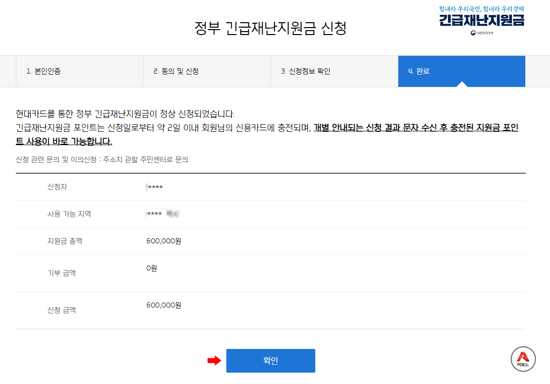 아래 신청하기 버튼 클릭 시, 현대카드 정부 긴급재난지원금이 신청되며 신청이 접수된 후에는 카드사 변경 및 취소가 불가능합니다. [신청하기] 클릭합니다.