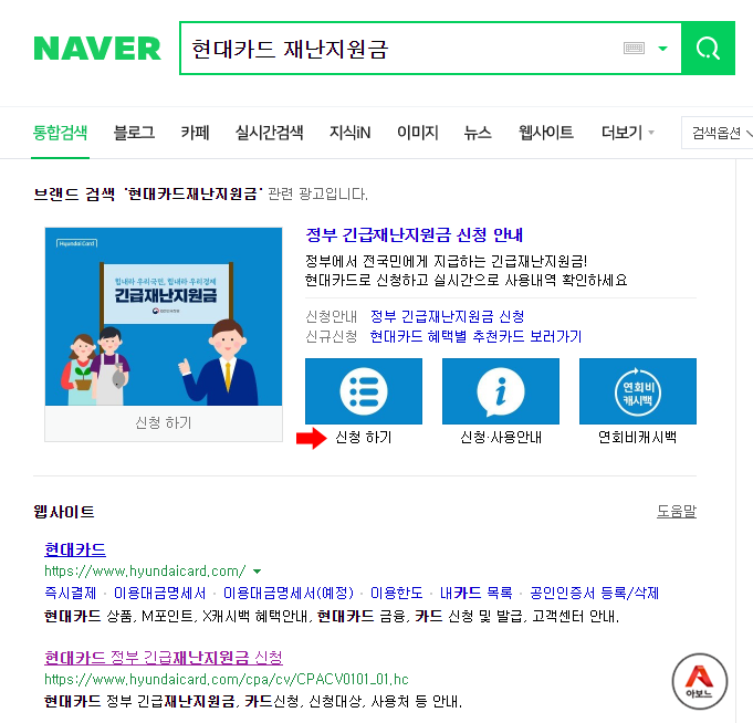 1. 네이버에서 '현대카드 재난지원금' 으로 검색 후 '신청 하기' 를 클릭합니다.