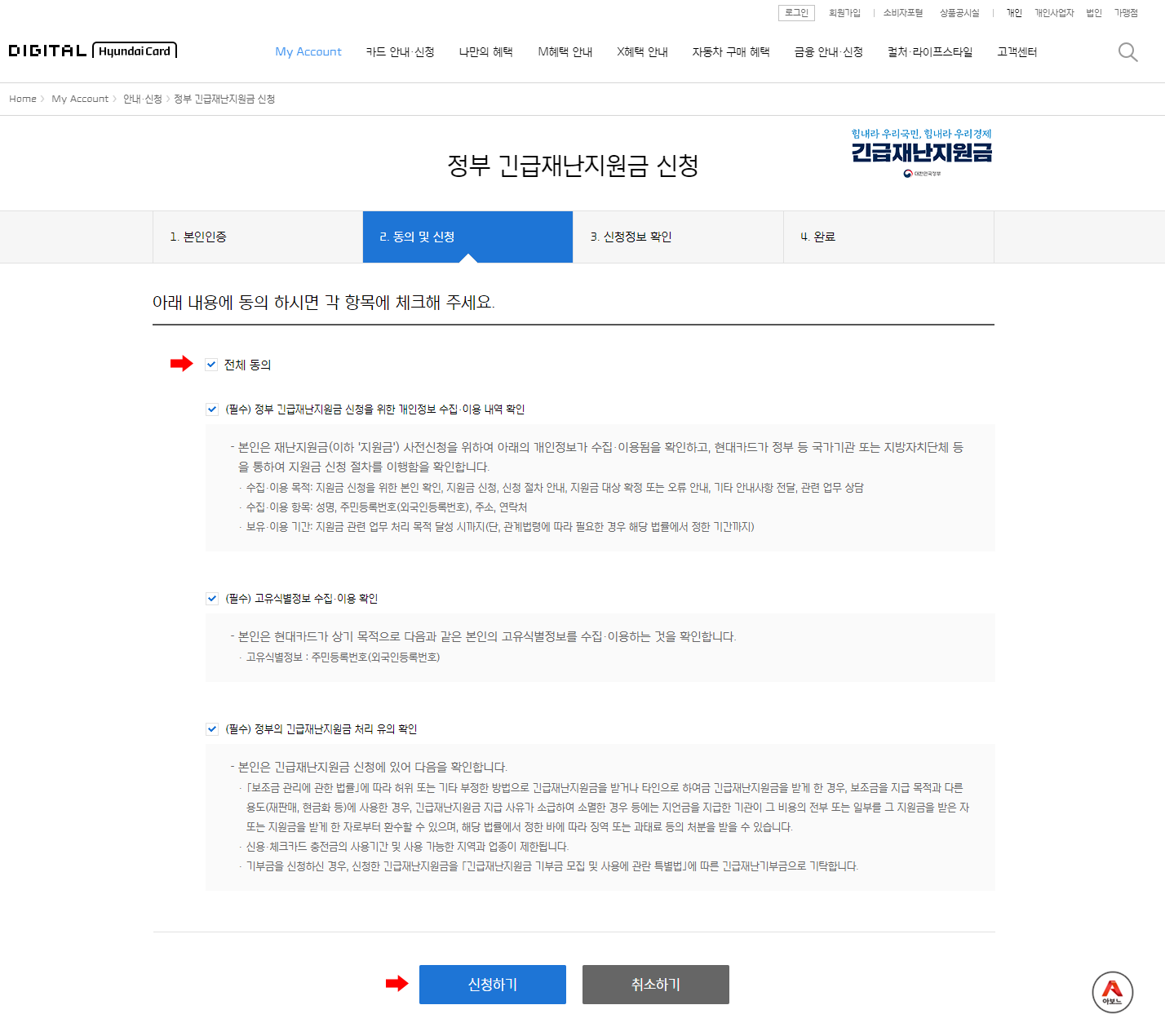 5. 본인인증 후 2단계로 [2. 동의 및 신청] 탭에서 [전체 동의]를 체크 후 [신청하기]를 클릭합니다.