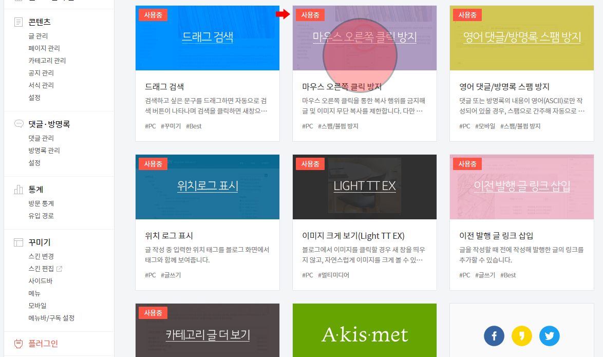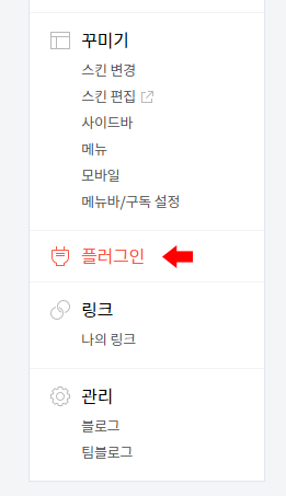 티스토리 관리자 페이지 > 왼쪽 메뉴 > 플러그인 클릭