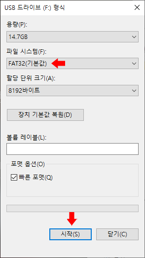 이 때, '파일 시스템(F)' 에서는 FAT32(기본값) 을 선택한 후 '빠른 포맷' 을 시작하세요!