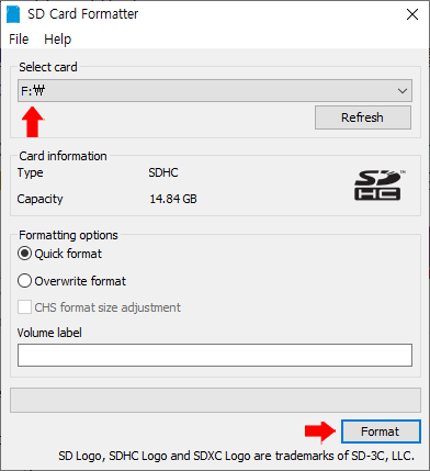 포맷할 카드를 선택 후 "Formatter" 버튼을 클릭합니다.