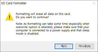 포맷을 계속 진행할 건지 팝업에 "예" 를 클릭합니다.