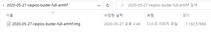 다운받은 파일을 압축 풀기를 하면 2020-05-27-raspios-buster-full-armhf.img 이미지 파일이 생깁니다.