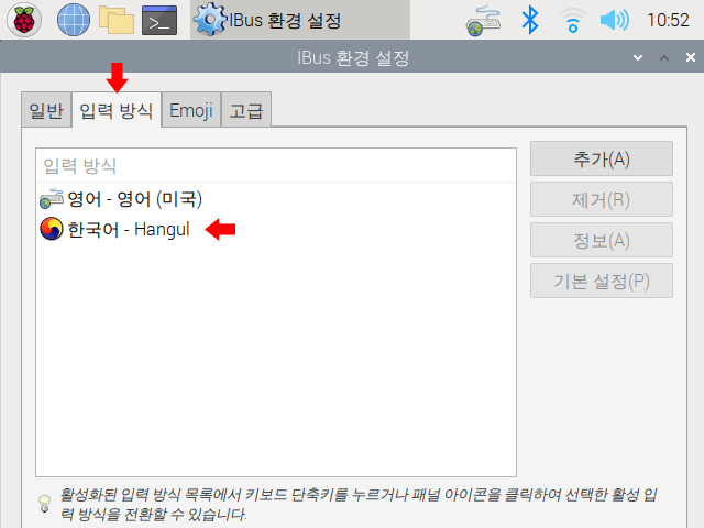 입력 방식 탭을 보면 '한국어 - Hangul' 이 보이고 있습니다.