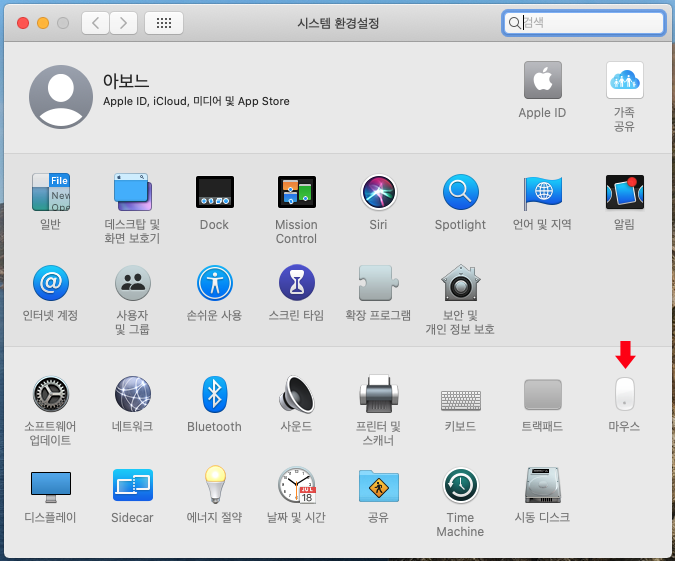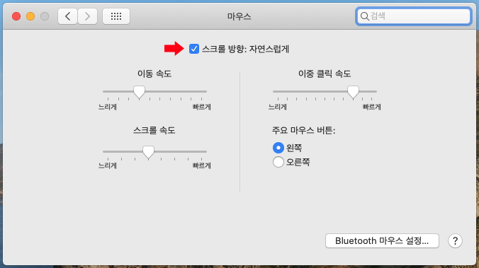 시스템 환경설정 > '마우스' 클릭