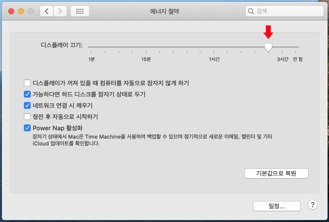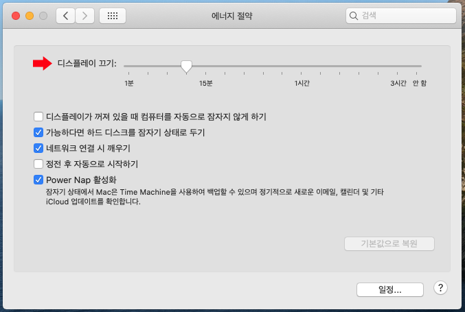기본으로 맥 화면 꺼지는 시간은 10분으로 되어 있습니다. 디스플레이 유지 시간을 늘이거나 끄는 방법입니다. 흔히, 디스플레이 설정에 있을 것 같지만 "에너지 절약" 메뉴에 있습니다.