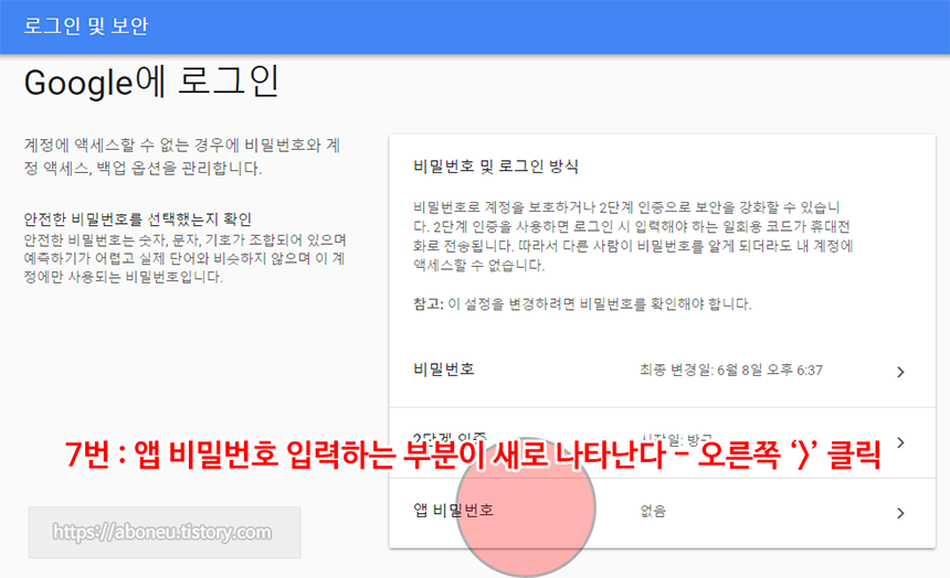 7번 : 앱 비밀번호 입력하는 부분이 새로 나타난다 - 오른쪽 ‘>’ 클릭