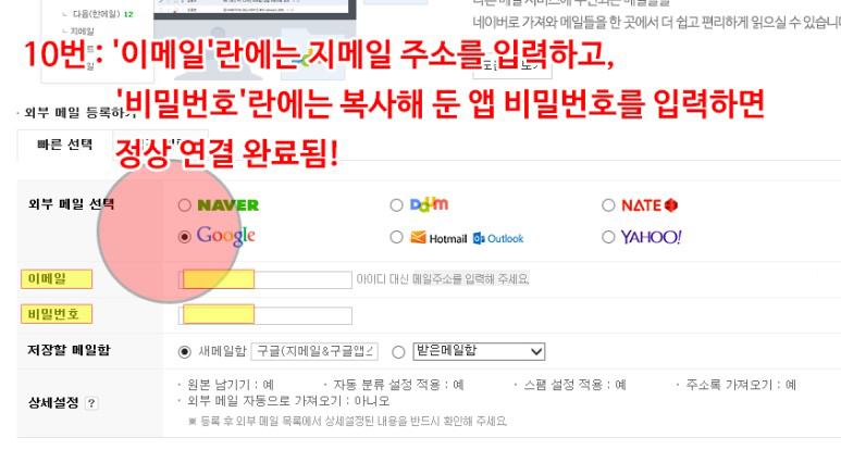 10번 : '이메일'란에는 지메일 주소를 입력하고, '비밀번호'란에는 복사해 둔 앱 비밀번호를 입력하면 정상 연결 완료됨!