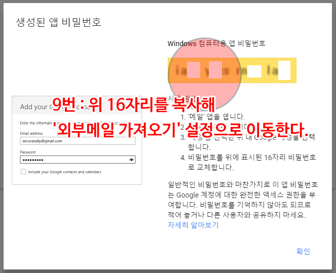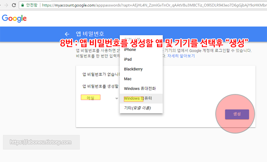 8번 : 앱 비밀번호를 생성할 앱 및 기기를 선택 후 “생성”