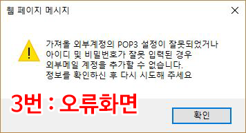 3번 : 그런데,, 가져올 외부계정의 POP3 설정이 잘못되었거나 아이디 및 비밀번호가 잘못 입력된 경우 외부메일 계정을 추가할 수 없습니다... 라고 오류가 뜬다.