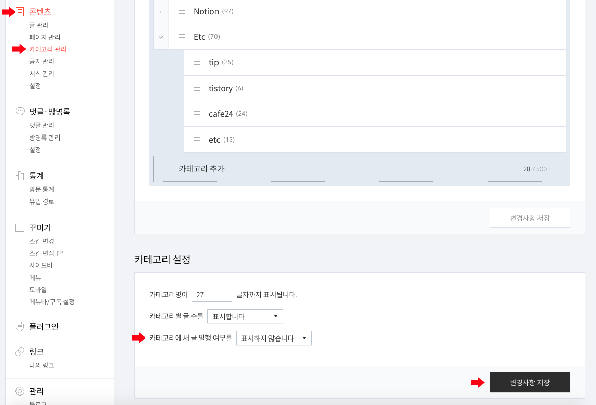 티스토리 관리자 페이지 > 왼쪽 '콘텐츠' > '카테고리 관리' 로 이동합니다.