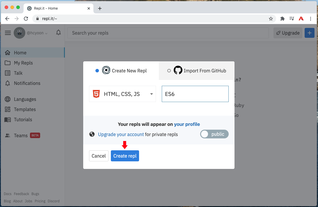 repl.it 에 로그인 된 첫 화면을 보면 왼쪽 상단에 자신의 '아이디' 가 표시됩니다.