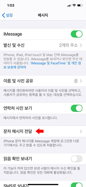 문자 메시지 전달을 위해서는 iPhone 문자 메시지를 iMessage 계정에 로그인한 다른 기기에서도 주고 받을 수 있도록 해당 설정부분을 허용해야 합니다.
