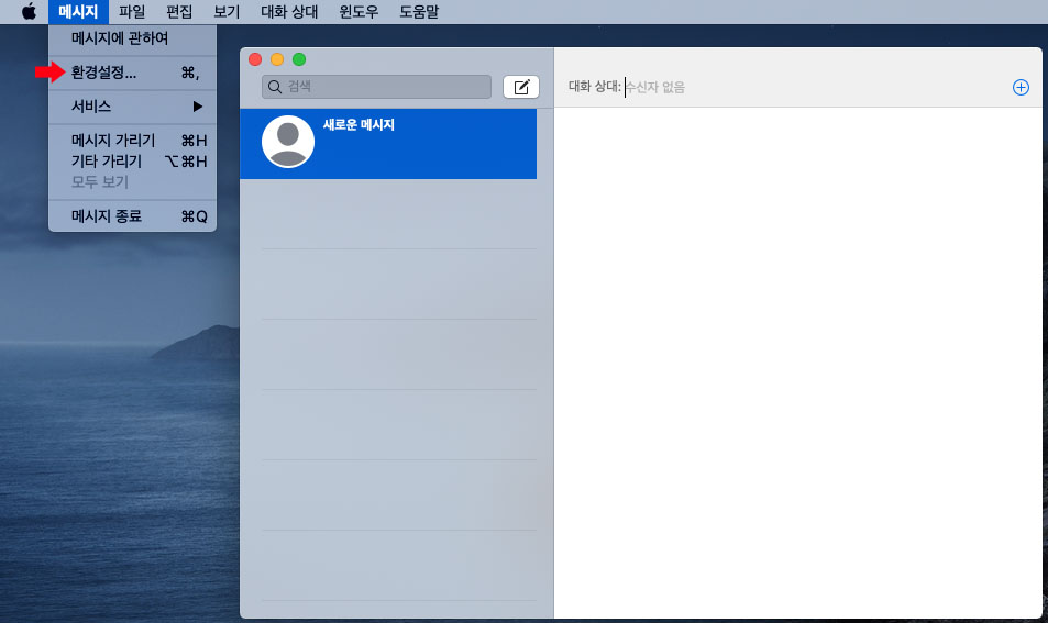 맥 기기에서 '메시지' 앱을 열고 '환경설정' 으로 이동해봅니다.