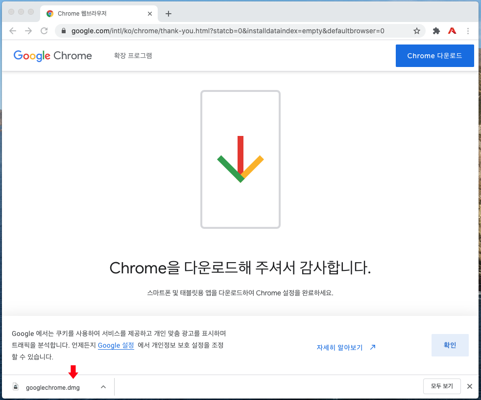 다운로드 폴더에서 'googlechrome.dmg' 설치 파일을 더블 클릭합니다.