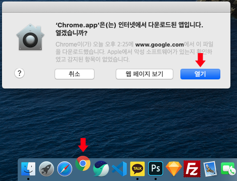 인터넷에서 다운로드된 앱입니다. 열겠습니까? 에 '열기' 를 클릭합니다.