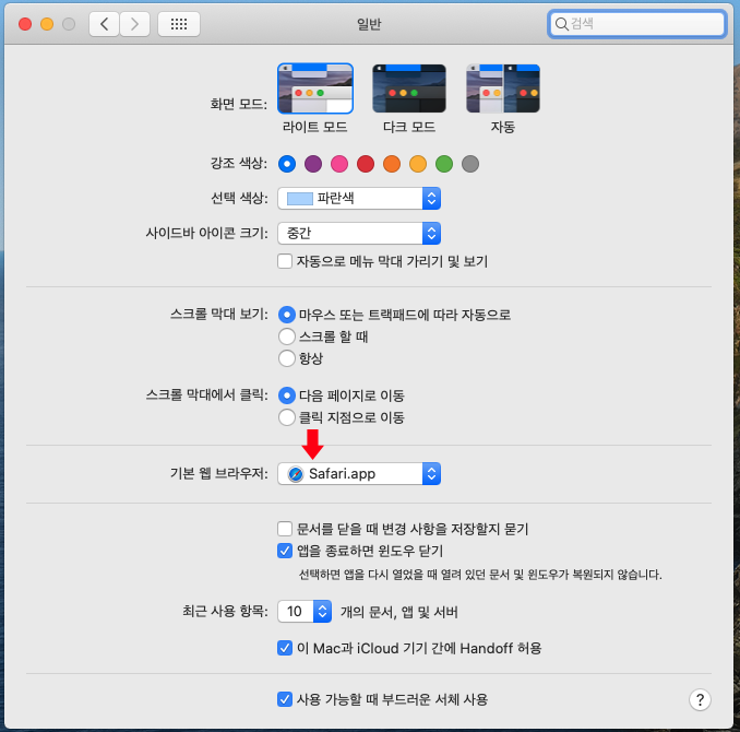 기본 웹 브라우저 : Safari.app 사파리 브라우저로 되어 있습니다.