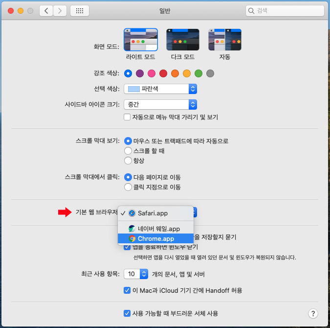 기본 웹 브라우저 우측에 화살표를 클릭하면 타 브라우저를 선택할 수 있습니다.