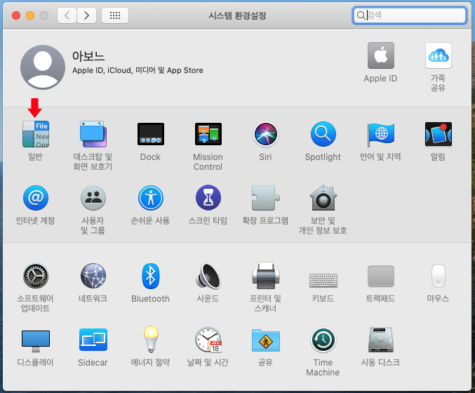 시스템 환경설정 > '일반' 으로 이동합니다.