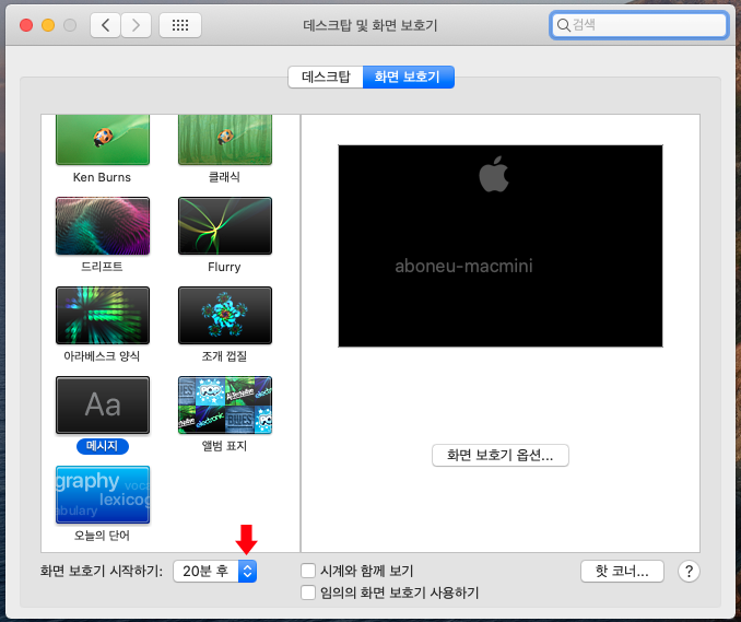 아래에 '화면 보호기 시작하기' 를 보면 현재 '20분 후' 로 체크되어 있습니다.