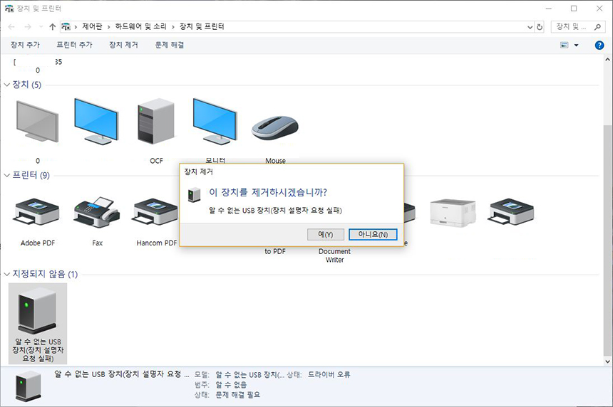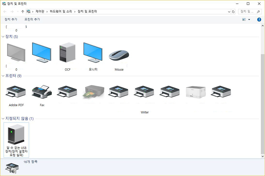 그리고 "제어판 > 하드웨어 및 소리 > 장치 및 프린터" 부분에도 확인하니