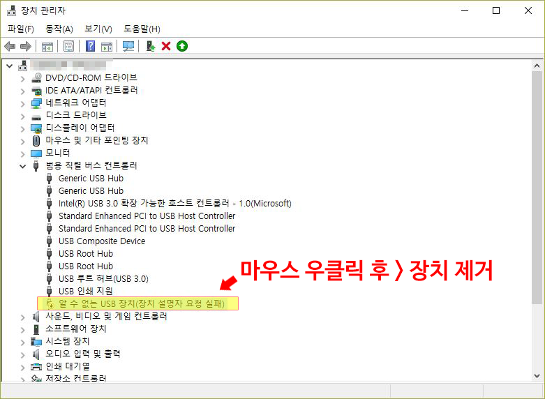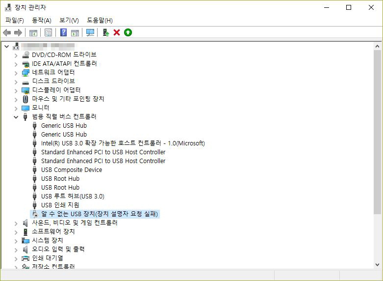 아래에 동일하게 "알 수 없는 USB 장치(장치 설명자 요청 실패)" 라고 뜬다.
