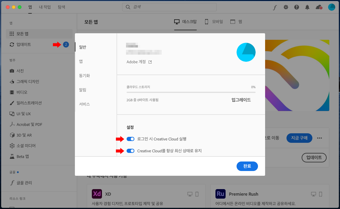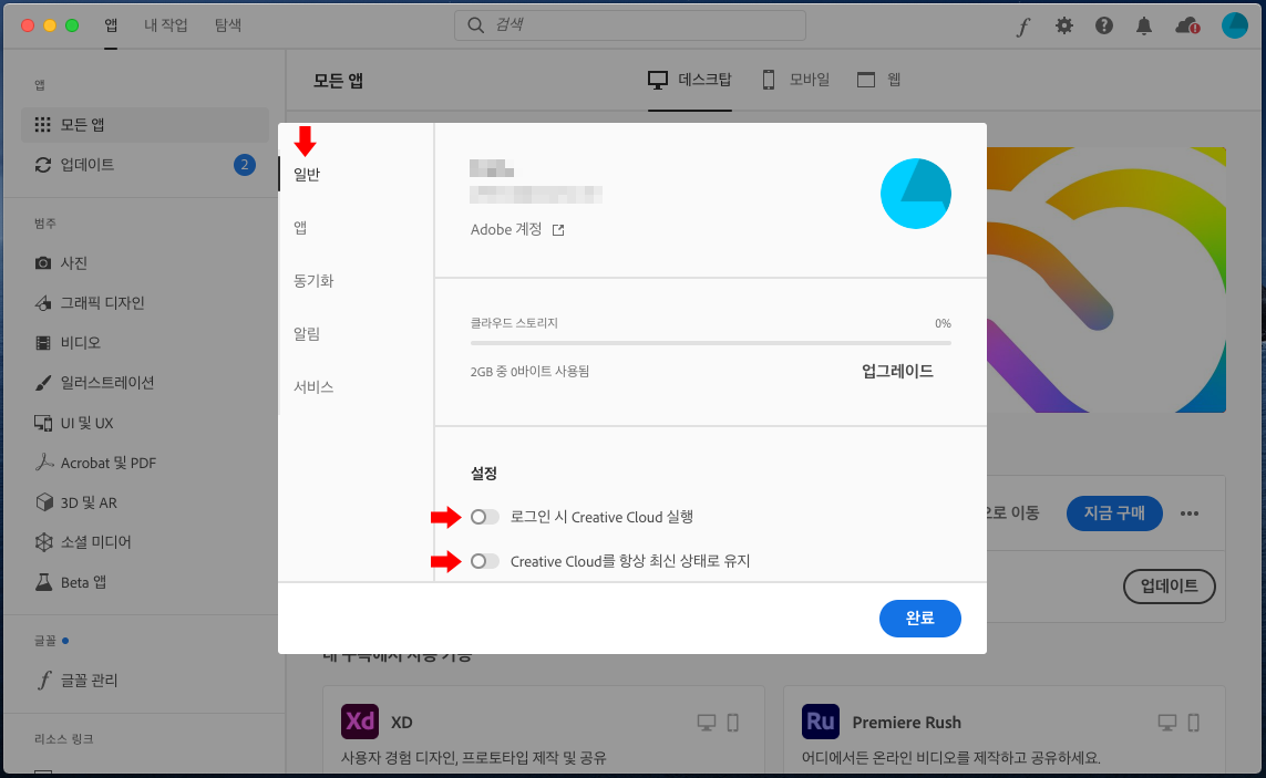- 로그인 시 Creative Cloud 실행 : 체크 해지