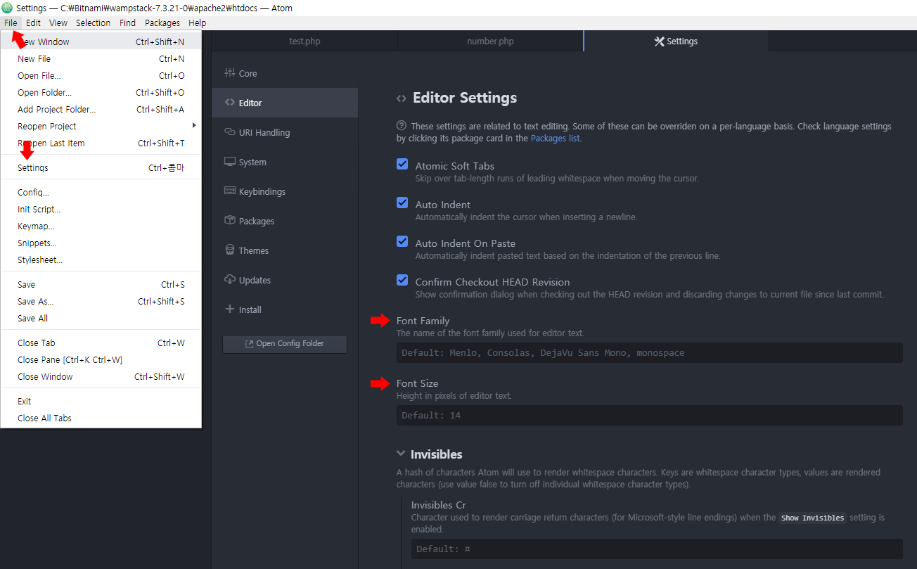 아톰 에디터에서 Font Family 폰트 변경 & Font Size 폰트 사이즈를 변경하기 위해서 Settings 설정페이지에서 변경을 하면 됩니다.