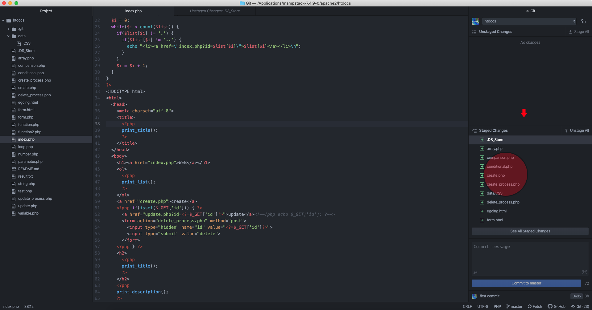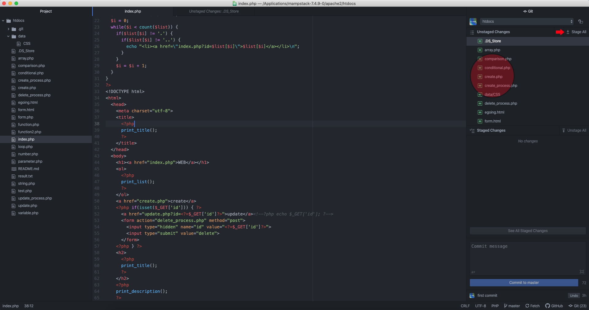다시, 아톰 에디터로 이동해서 오른쪽 git 화면상에서 'Stage All' 을 클릭합니다.