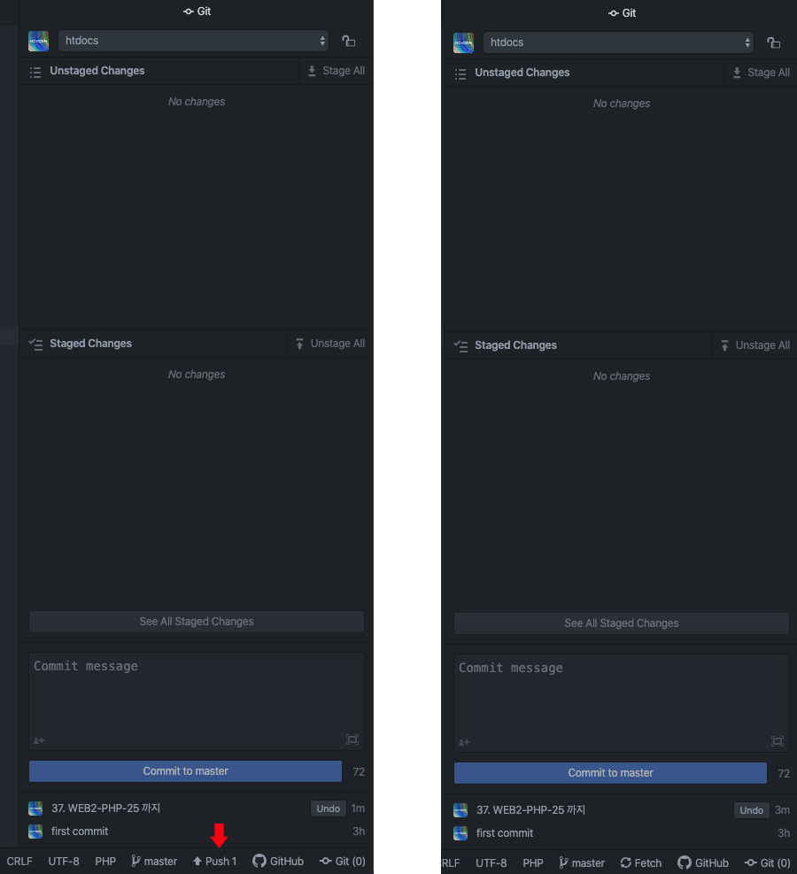 오른쪽 젤 아래에 커밋 내용을 입력하고 'Commit to master' 버튼을 클릭합니다.