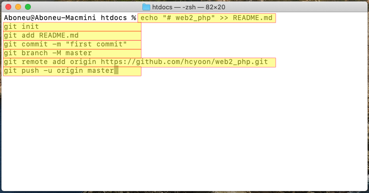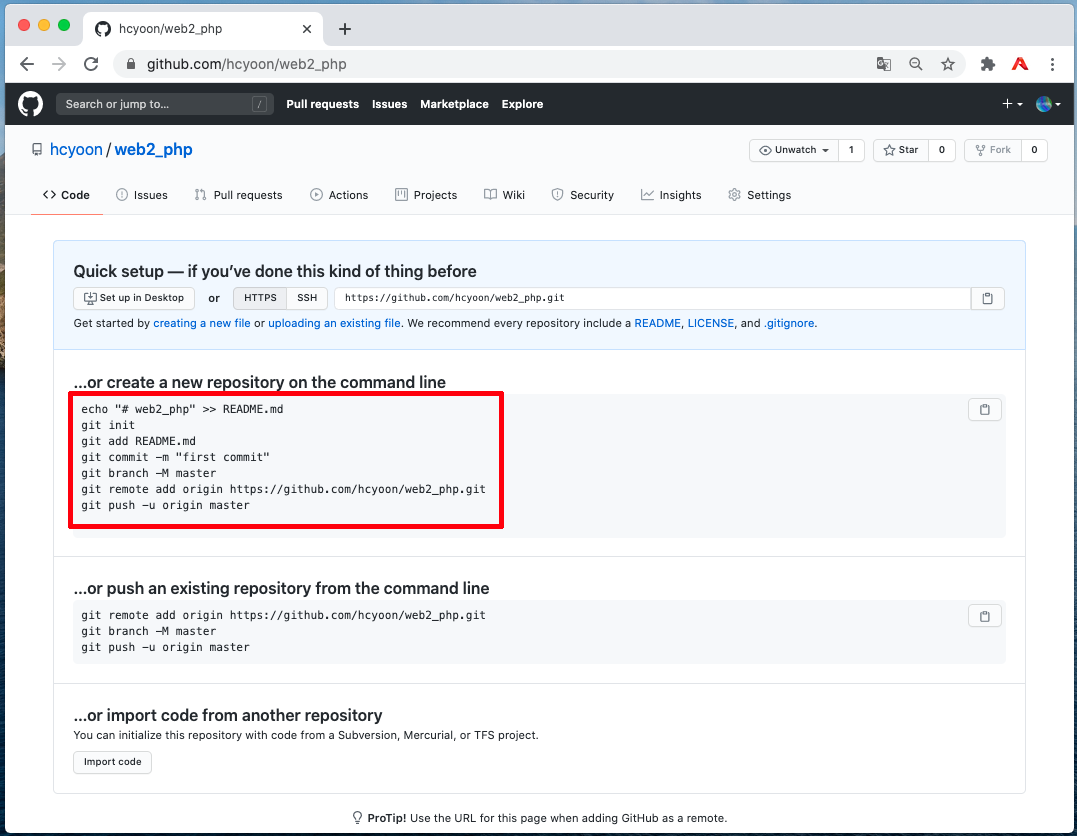 레포지토리 생성 후 넘어가는 화면에서 아래 빨간색 네모 칸 안에 내용들을 복사해 놓습니다.