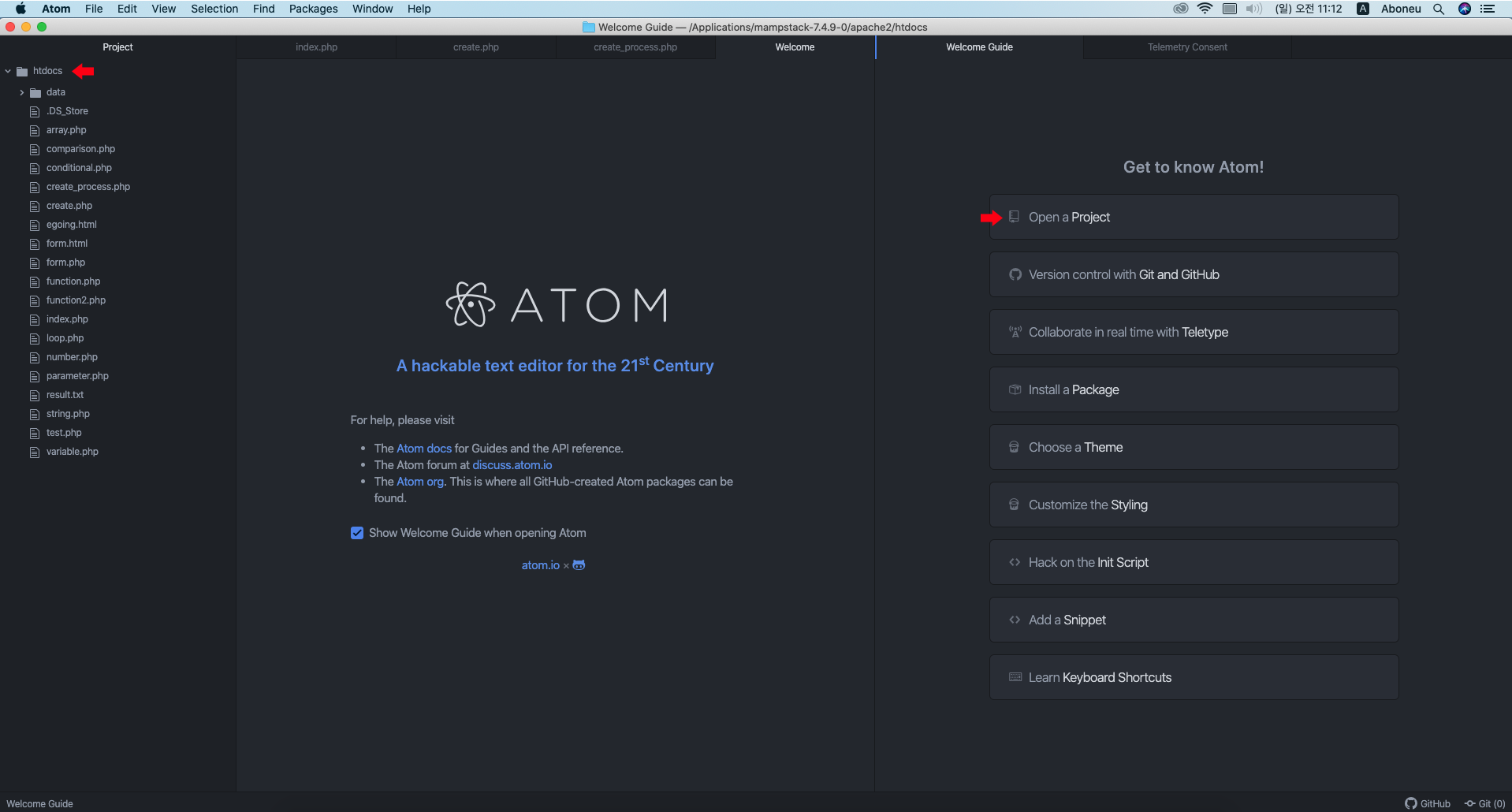 아톰 에디터를 실행 후 'Open a Project' 폴더를 왼쪽 화면처럼 프로젝트 폴더를 엽니다.