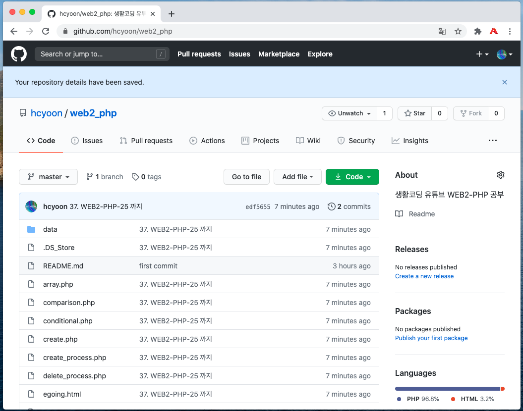 'Push' 를 하고 나면 오른쪽 화면처럼 깃허브 사이트로 전송됩니다.