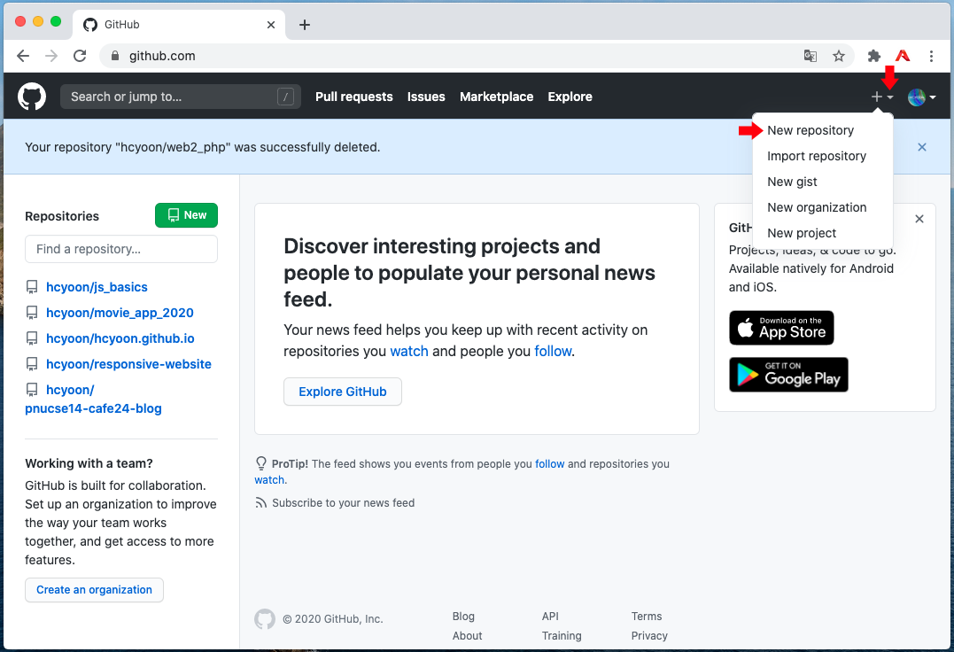 깃허브 페이지에서 'New repository' 를 생성합니다.