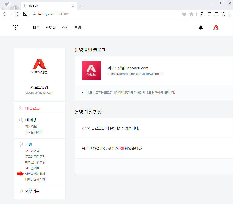 왼쪽 메뉴에서 보안 > '아이디 변경하기' 를 클릭합니다.