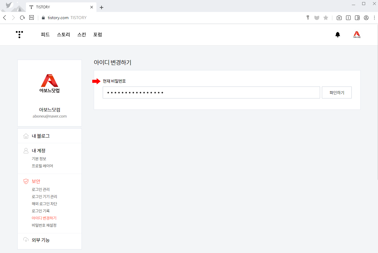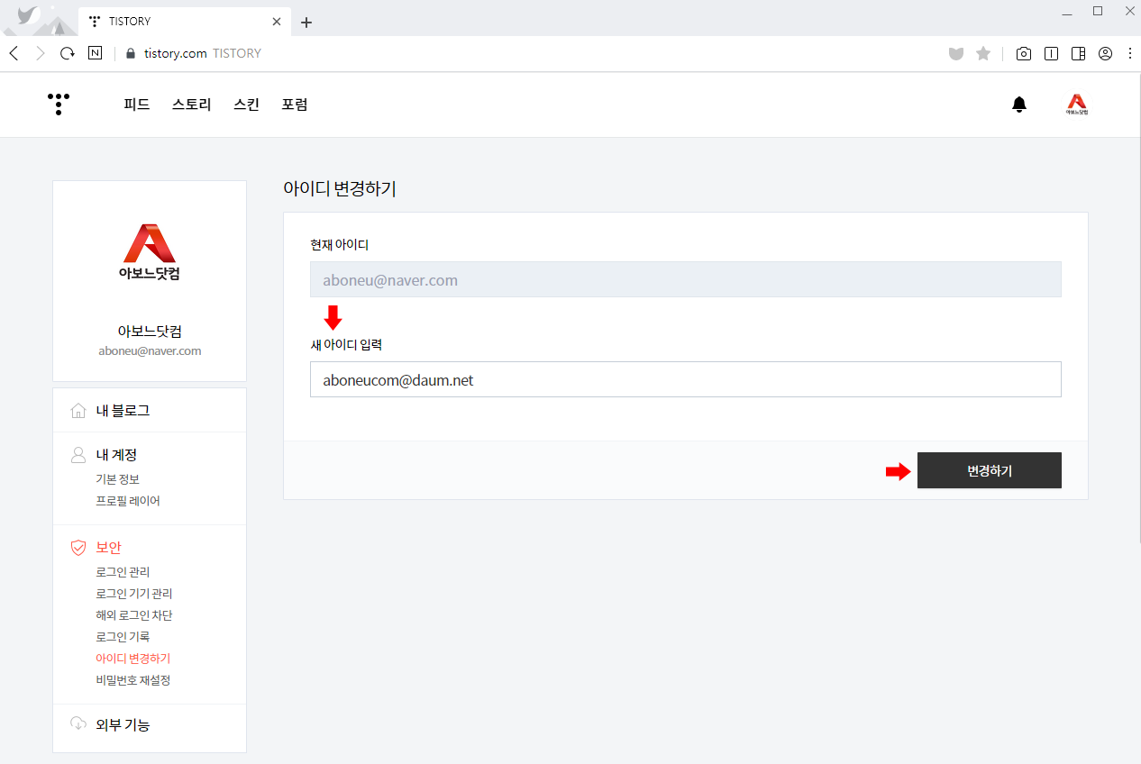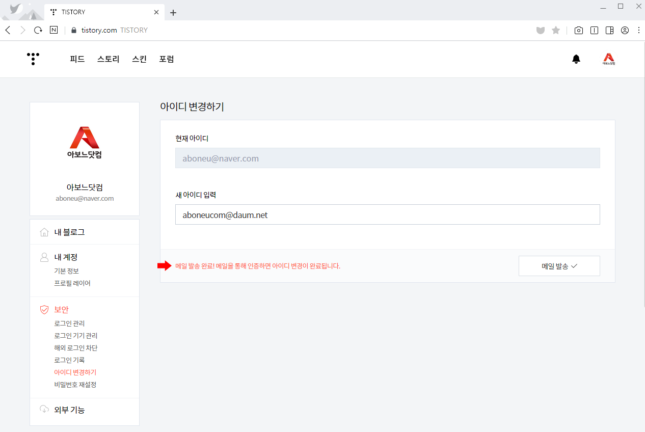 티스토리에서 온 메일에서 '아이디 변경' 버튼을 클릭합니다.