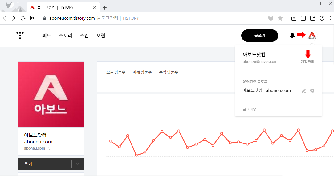 티스토리 관리자 페이지로 접속한 후 우측 상단에 '계정 아이콘' 을 클릭합니다.