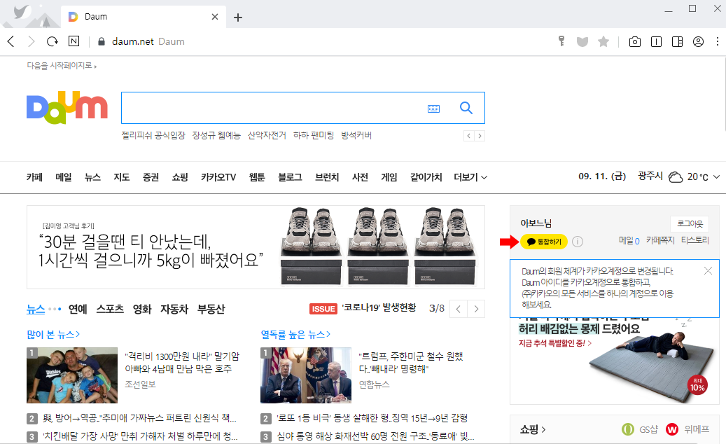 로그인된 우측 로그인 창에서 보면 닉네임 아래에 '통합하기' 버튼을 클릭합니다.