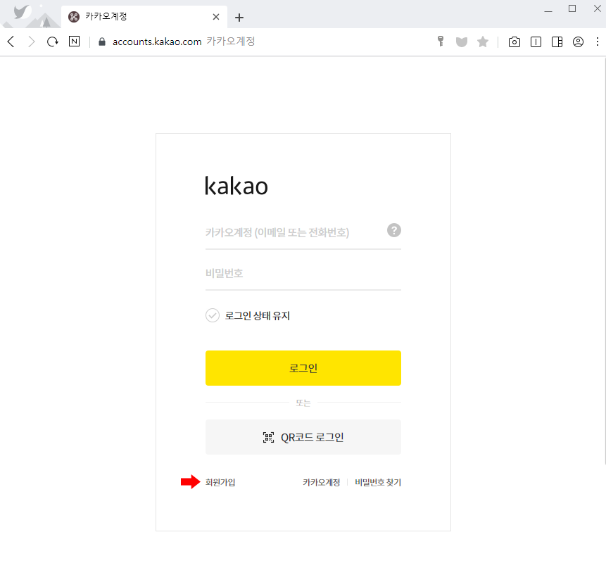 아래에 '카카오계정으로 로그인' 을 클릭 후 앞으로 접속해야 합니다.