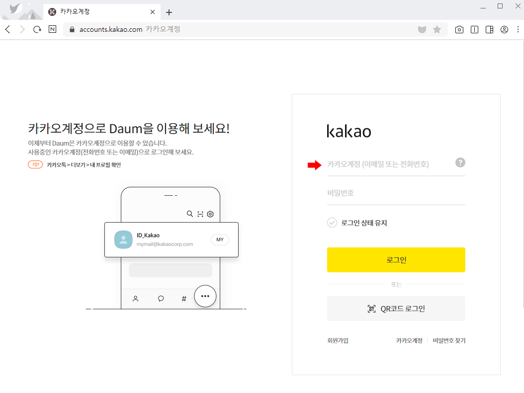 카카오계정 즉(기존 다음 이메일 주소)를 입력하고 로그인하시면 됩니다.