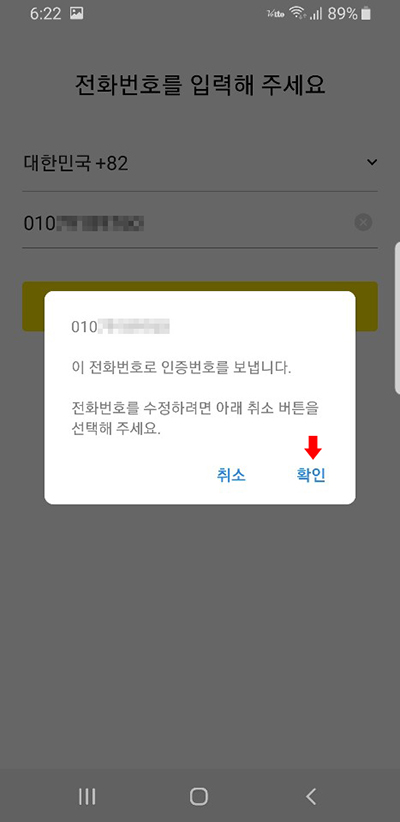 자신의 휴대폰 번로를 입력 후 '확인'을 클릭합니다.