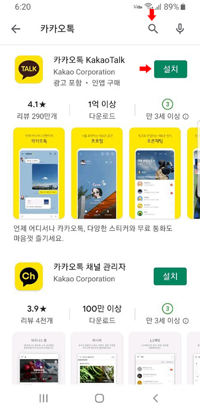 'Play 스토어' or 'App Store' 를 실행시켜서 '카카오톡' 을 검색 후 '설치' 합니다.