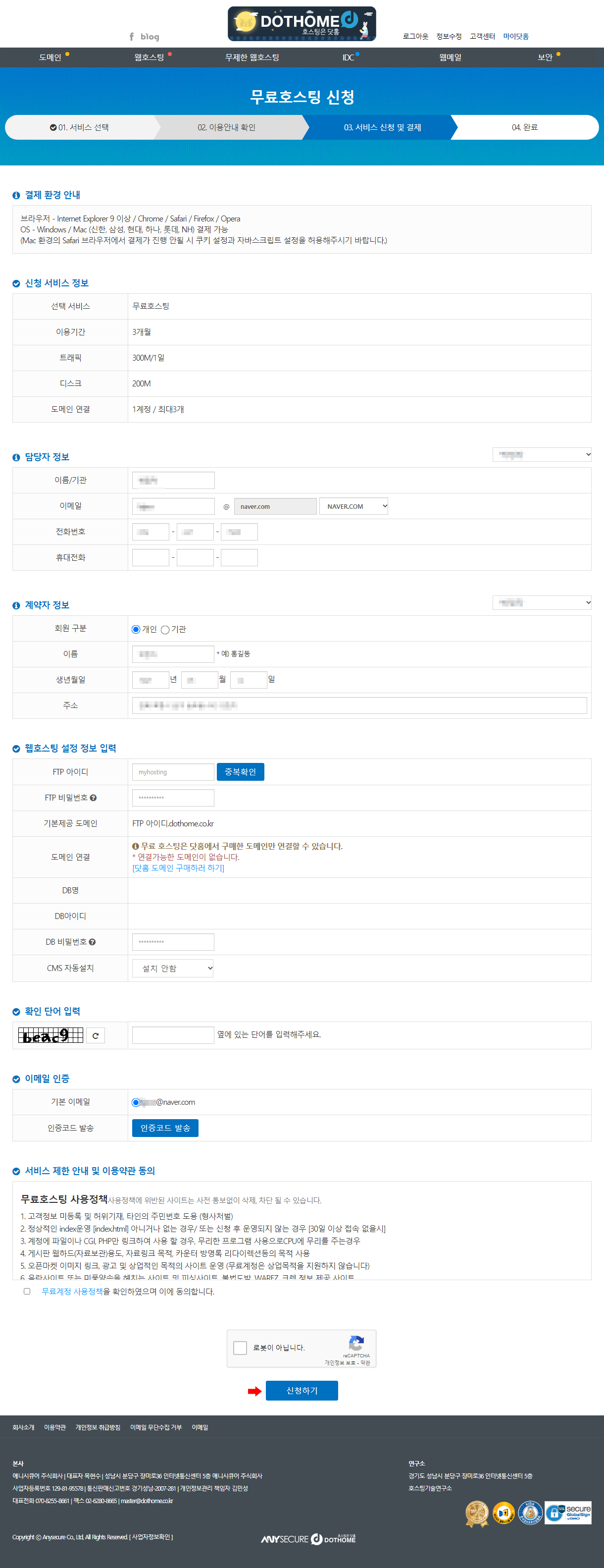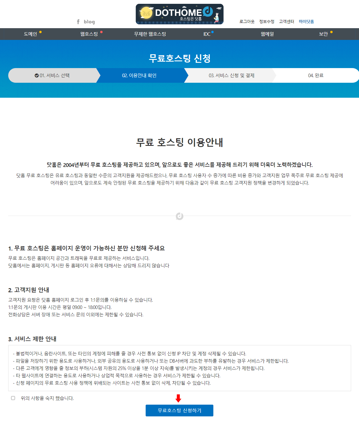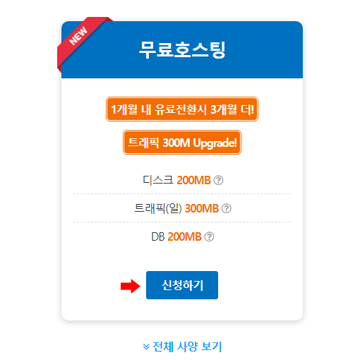 무료호스팅 사양은 이와 같습니다. 04번 과정 화면에서 보이는 곳에 '신청하기' 를 클릭하면 됩니다.