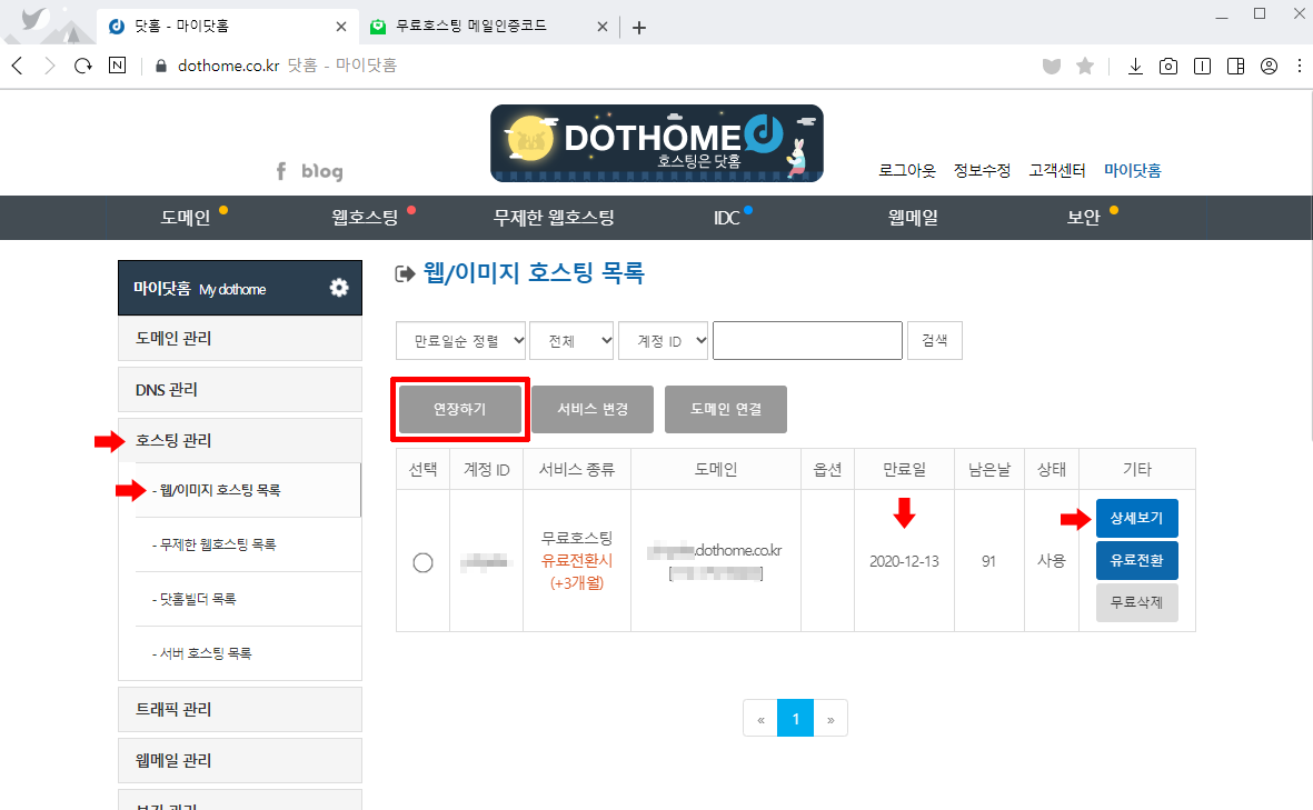 왼쪽 메뉴 호스팅 관리 > 웹/이미지 호스팅 목록 을 클릭하면 됩니다.
