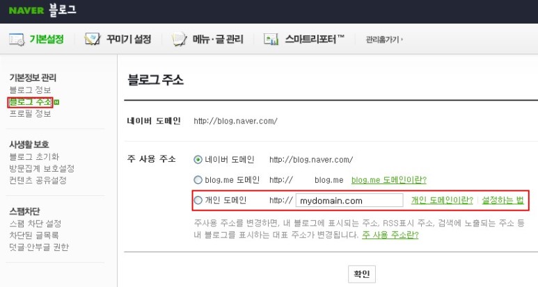 [기본 설정 > 기본정보관리 > 블로그 주소] 메뉴에 들어가시면 [주 사용 주소] 에서 개인 도메인을 선택 하시고, 고객님의 도메인 주소를 입력 하시면 됩니다.