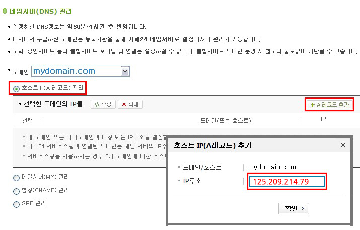 B. 도메인의 호스트IP(A 레코드) 입력 하기